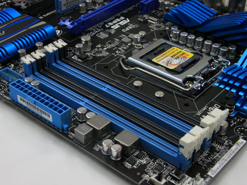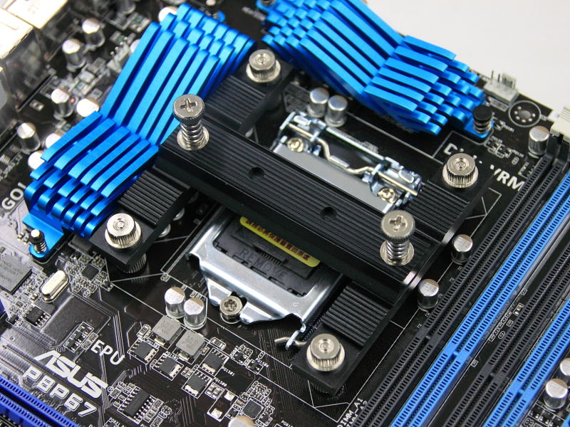 ▲ 青いヒートシンクが搭載されている電源回路は12+2フェーズとなっています。P8P67の電源回路はDIGI+ VRMと呼ばれるデジタルVRMが採用されており、これを電力管理コントローラのEPUによって1フェーズ刻みで制御可能と言われています。