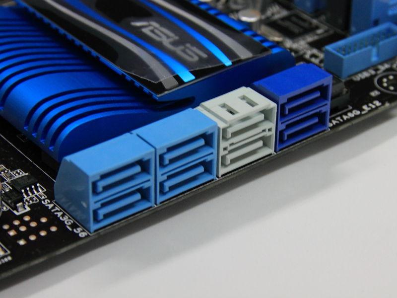 ▲ ストレージ用のSerial ATAは8ポート用意されており、水色のポートがSATA 3Gbps、グレーと青色のポートがSATA 6Gbpsに対応しています。マニュアルによれば、青色のSATA 6Gbpsは Marvell 9120 で提供されているポートのようです。