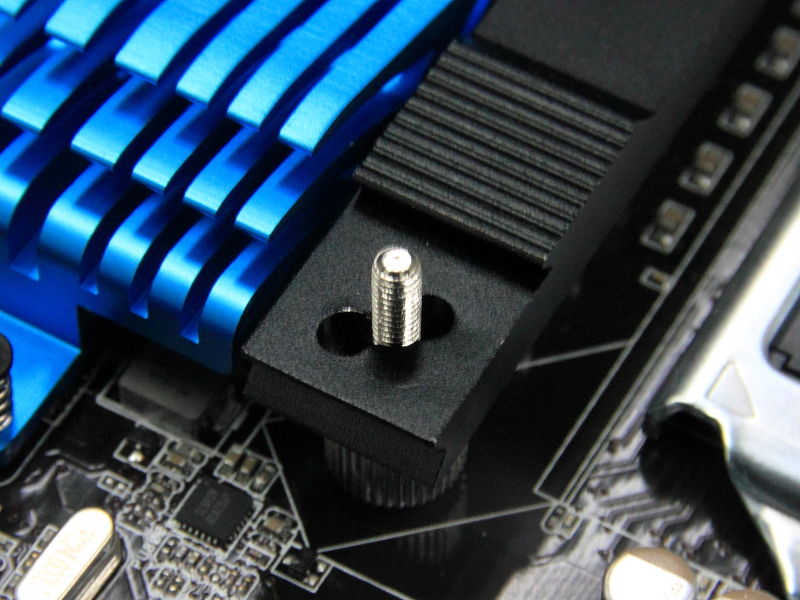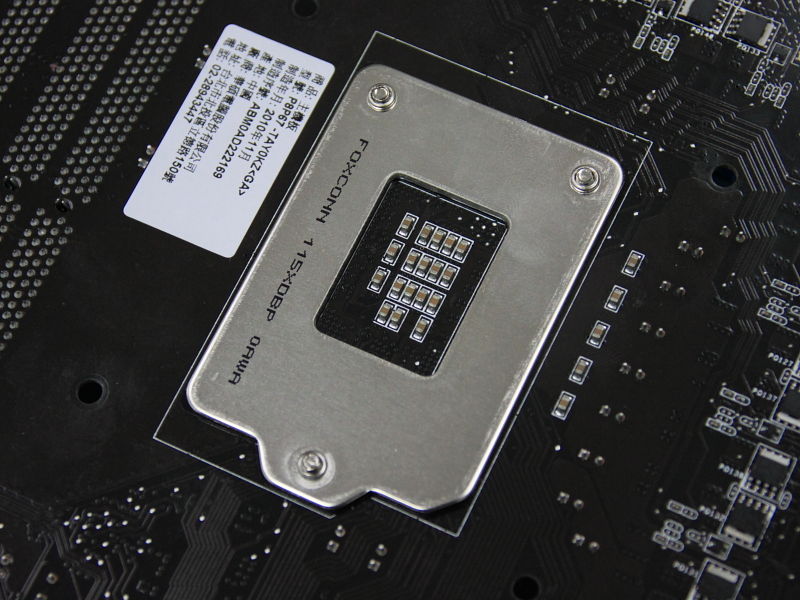 ▲ CPUソケットはLGA 1156に非常によく似た形状をしており、CPUクーラー取り付け用の穴位置もLGA 1156と同じ位置にあります。ためしに当店で人気のCPUクーラーPROLIMA TECH Megahalems Rev.Bのリテンションを取り付けてみたところ、LGA 1156用の穴位置で取り付けることができました。