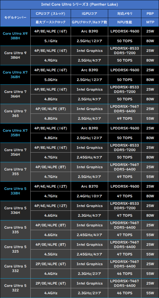 Panther LakeことCore Ultra シリーズ3は、モバイルノート向けの省電力モデルから、高性能ノートPC向けのハイパフォーマンスモデルまで幅広いバリエーションが用意されており、多様な製品に採用されることになるでしょう。